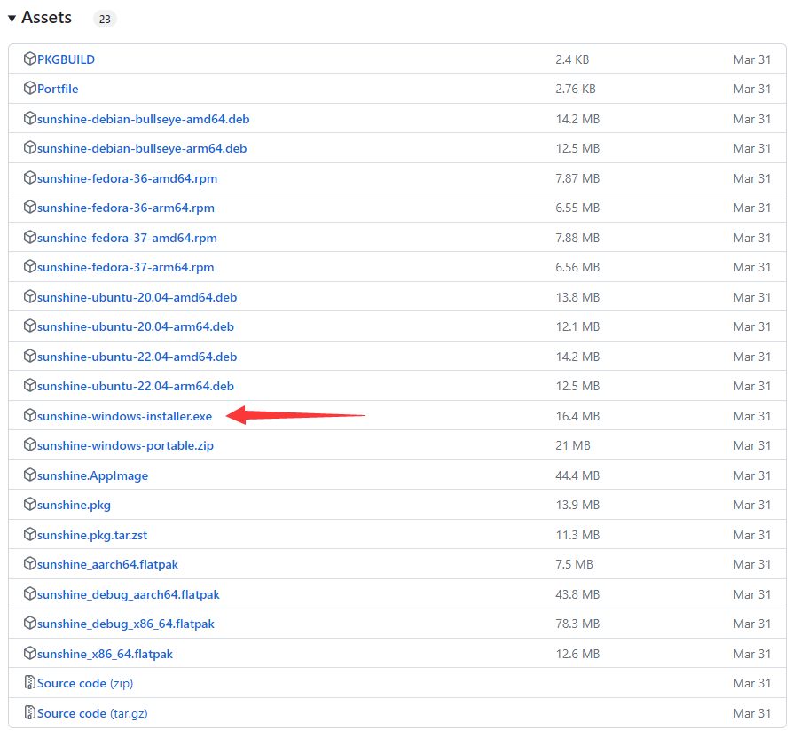 Windowsの場合、sunshine-windows-installer.exeを選んでください。